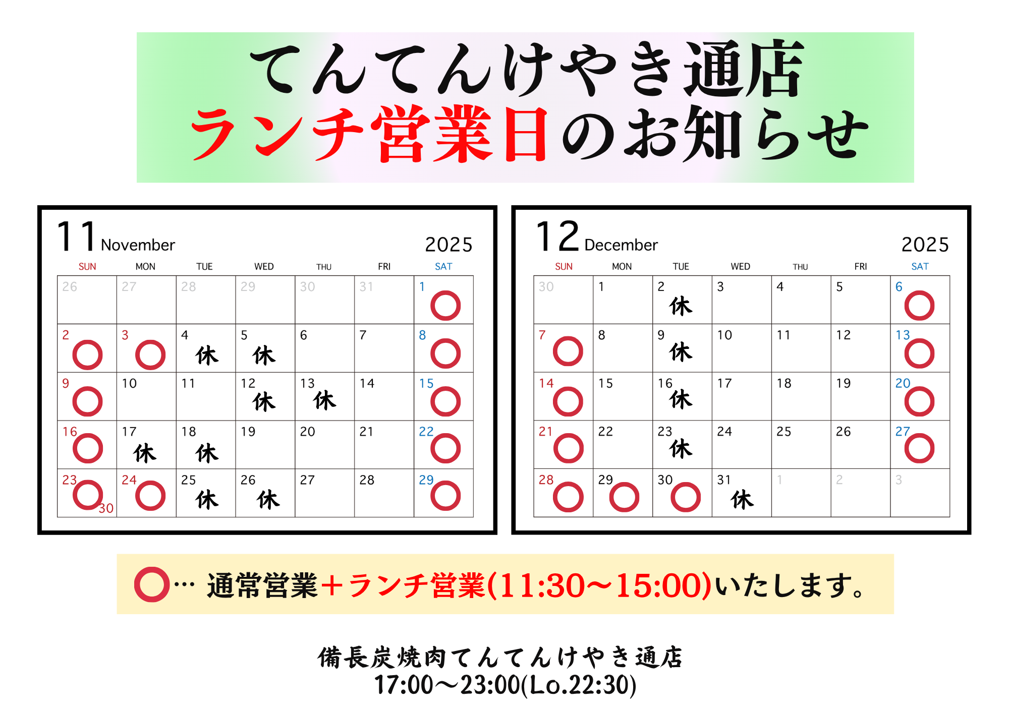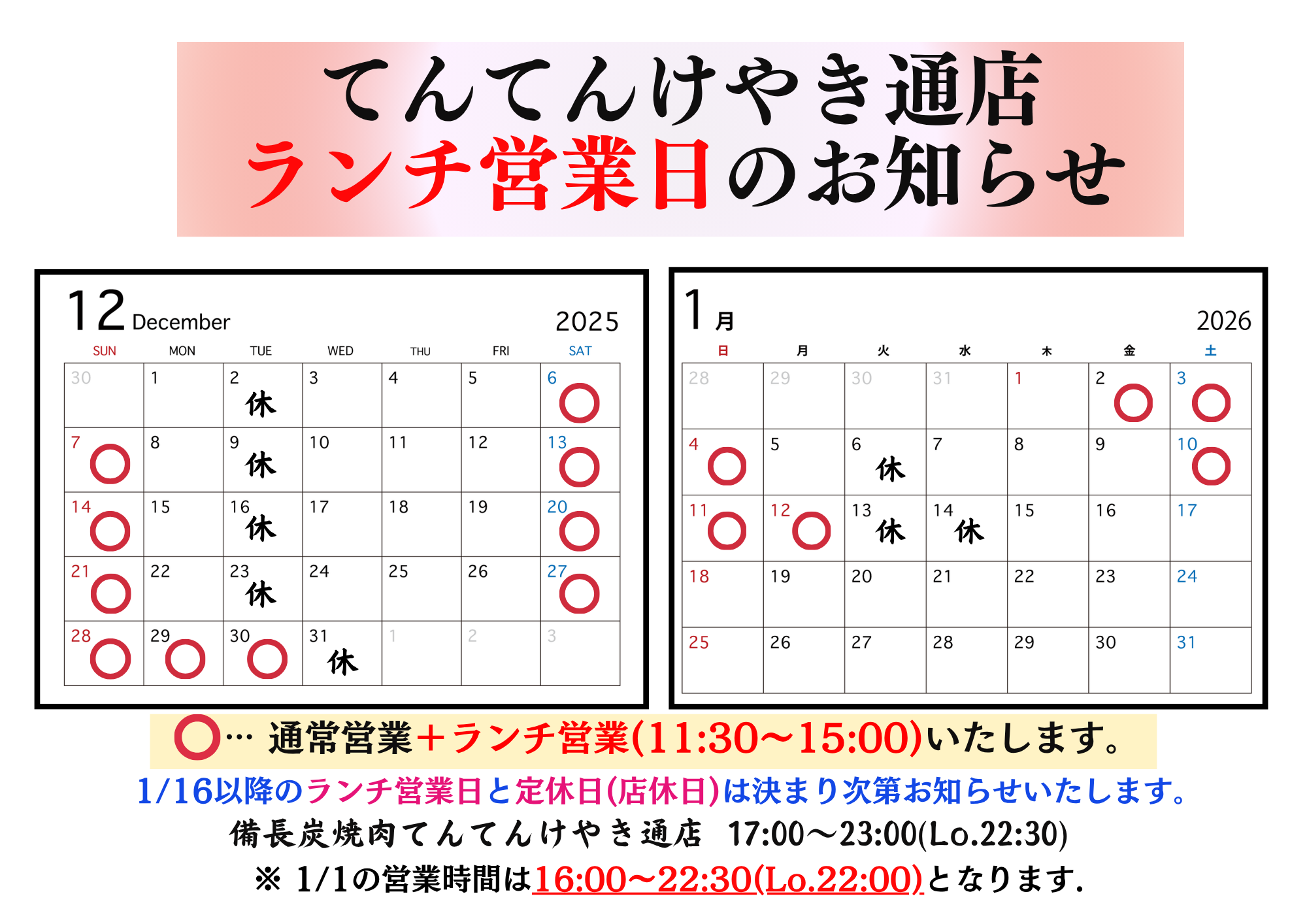 けやき通店におきまして2026年1月15日までのランチ営業の日程が決まりましたのでお知らせいたします。