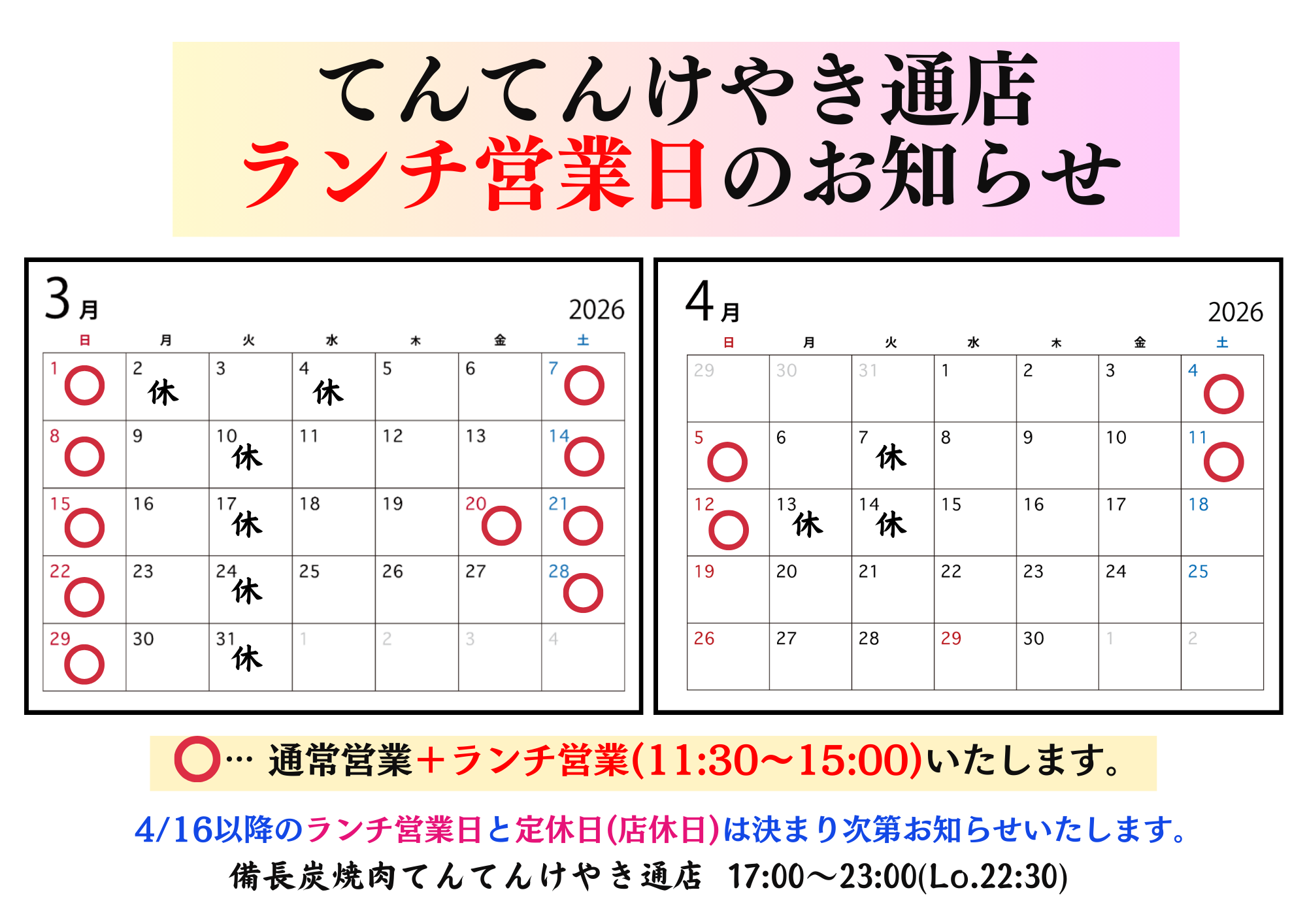 けやき通店におきまして2026年3月15日までのランチ営業の日程が決まりましたのでお知らせいたします。